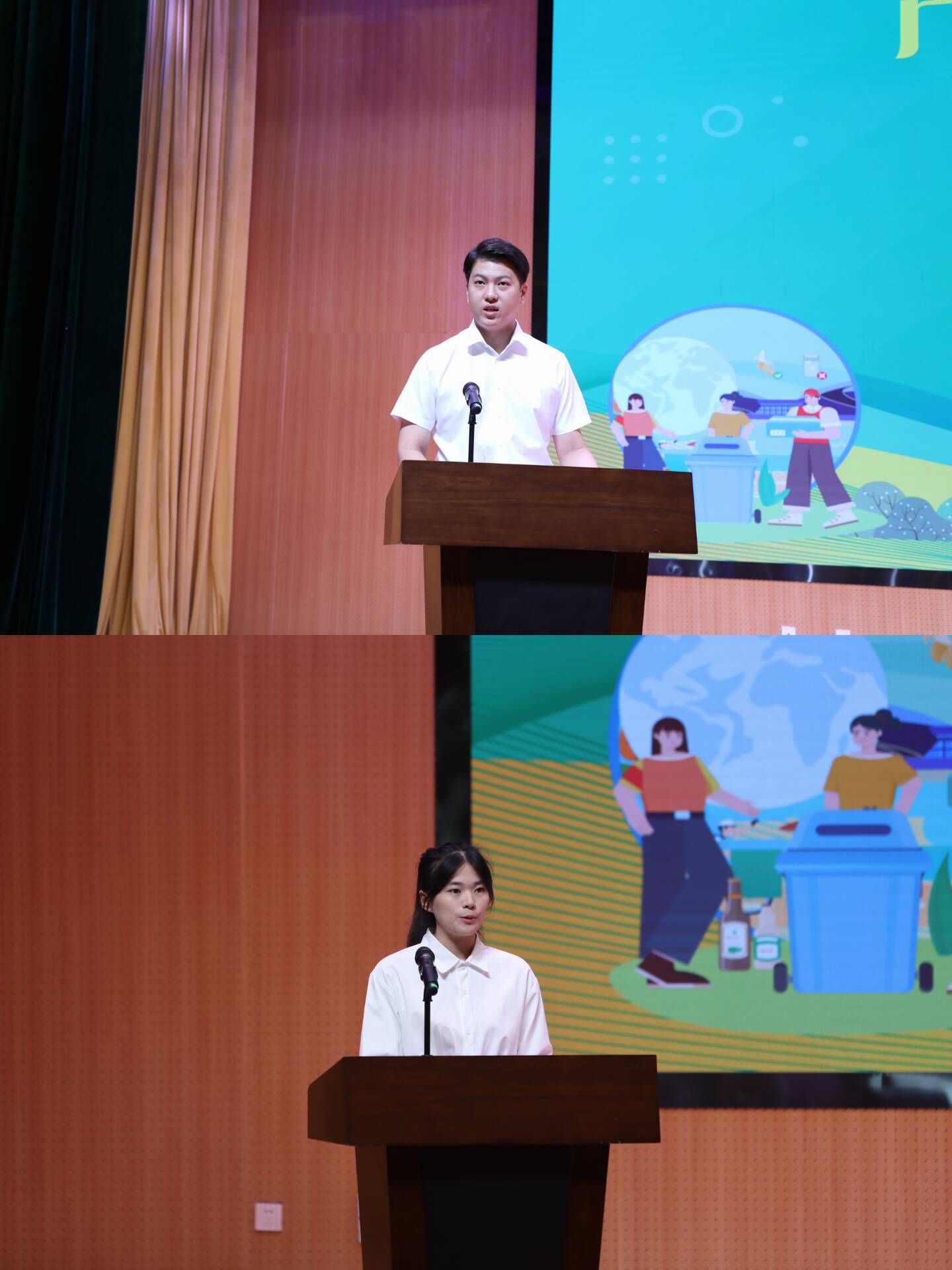 我校教師代表崔鵬飛上臺發(fā)言,結(jié)合教學、科研和社會實踐,分享了如何引導(dǎo)學生樹立正確的垃圾分類觀念,激發(fā)學生從“知”到“行”的綠色自覺;學生代表鄧琳上臺發(fā)言,表示將積極參與垃圾分類,爭做垃圾分類的倡導(dǎo)者和綠色生活的踐行者,為建設(shè)美麗校園、建設(shè)壯美廣西貢獻自己的一份力量。