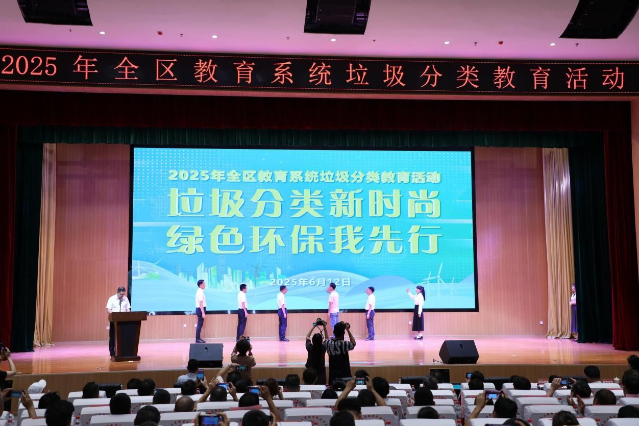 隨后,萬鋒鋒、謝增來、梁鵬昌、林昆榮以及我校師生代表上臺,共同按下活動啟動鍵,全體與會人員共同見證綠色征程的開啟。這象征著2025年全區(qū)教育系統(tǒng)垃圾分類教育巡講活動正式啟動,也標志著全區(qū)垃圾分類教育進入新階段。
