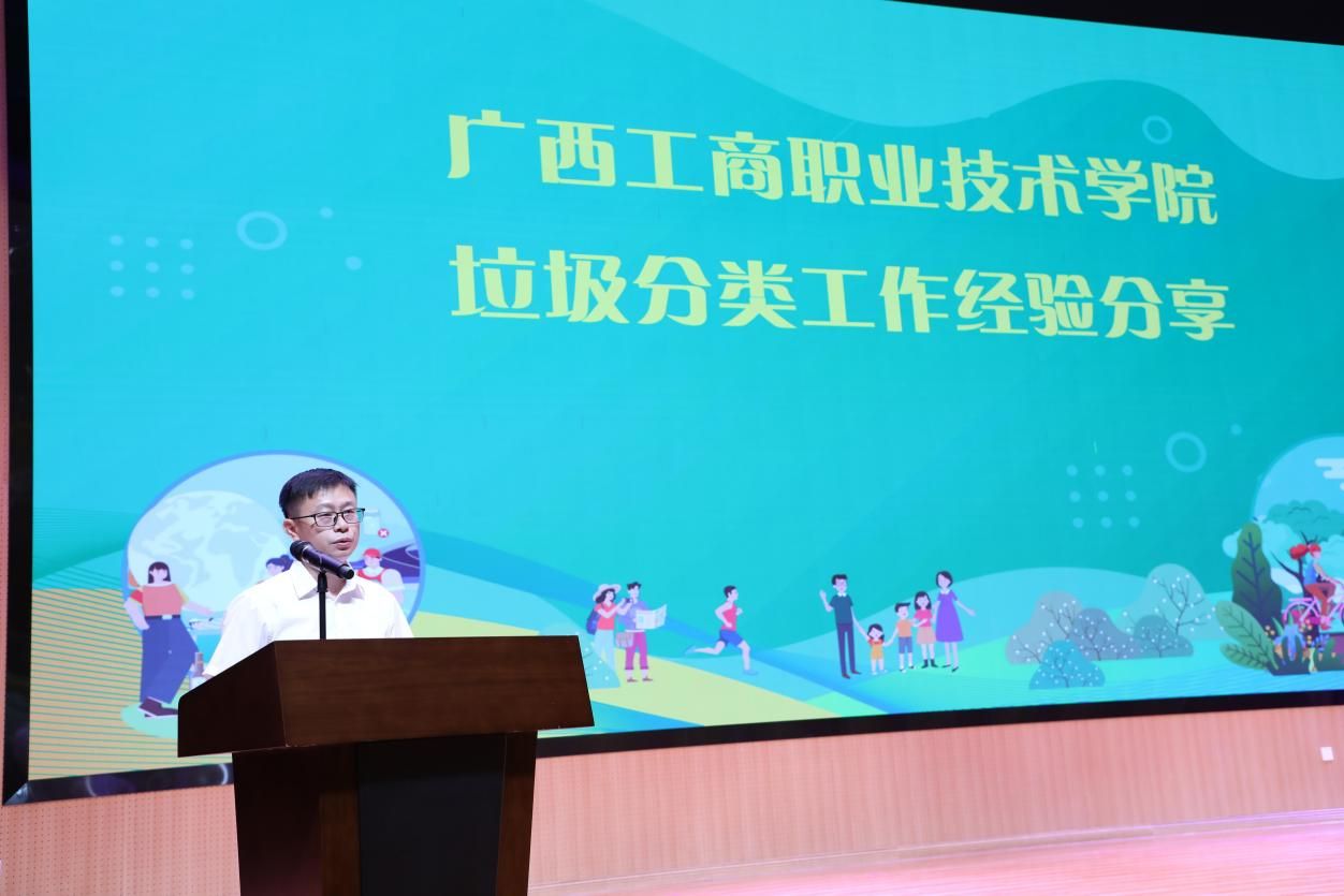 南寧市武鳴區(qū)住房和城鄉(xiāng)建設(shè)局副局長梁鵬昌作生活垃圾分類工作經(jīng)驗分享,向與會人員介紹了“政府主導(dǎo)、部門協(xié)同、社會參與、全民行動”的垃圾分類工作格局。我校后勤管理處處長林昆榮作垃圾分類工作經(jīng)驗分享,介紹學校垃圾分類工作具體做法,為大家提供了可復(fù)制的經(jīng)板模板和多元化的垃圾分類工作思路。