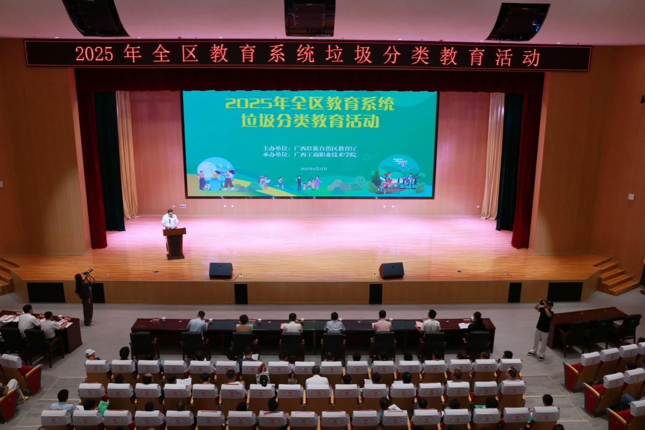 為深入貫徹落實習近平總書記關(guān)于垃圾分類系列重要指示精神,落實國家和自治區(qū)有關(guān)部署要求,進一步提升全區(qū)校園生活垃圾分類工作成效,2025年6月12日,由自治區(qū)教育廳主辦、廣西工商職業(yè)技術(shù)學院承辦,以“垃圾分類新時尚,綠色環(huán)保我先行”為主題的全區(qū)教育系統(tǒng)垃圾分類教育活動在我校武鳴校區(qū)舉行,自治區(qū)教育廳體育衛(wèi)生與藝術(shù)教育處處長萬鋒鋒、自治區(qū)住房和城鄉(xiāng)建設(shè)廳城市管理監(jiān)督局二級調(diào)研員謝增來、自治區(qū)教育廳體育衛(wèi)生與藝術(shù)教育處二級調(diào)研員李春春、南寧市武鳴區(qū)住房和城鄉(xiāng)建設(shè)局副局長梁鵬昌,以及全區(qū)各高等學校后勤處處長,各市教育局副局長或業(yè)務(wù)部門負責人,各市直屬小學、初中、高中階段校長和我校師生代表共計500多人參加活動。學校黨委副書記、校長劉進出席參加啟動儀式并講話,副校長陳寧春主持啟動儀式。