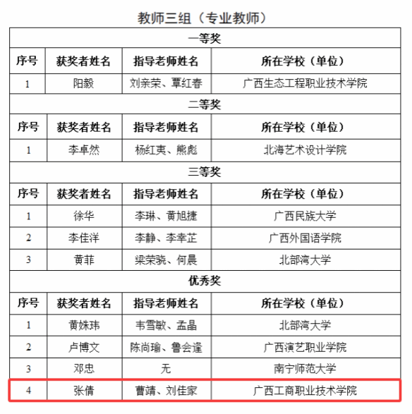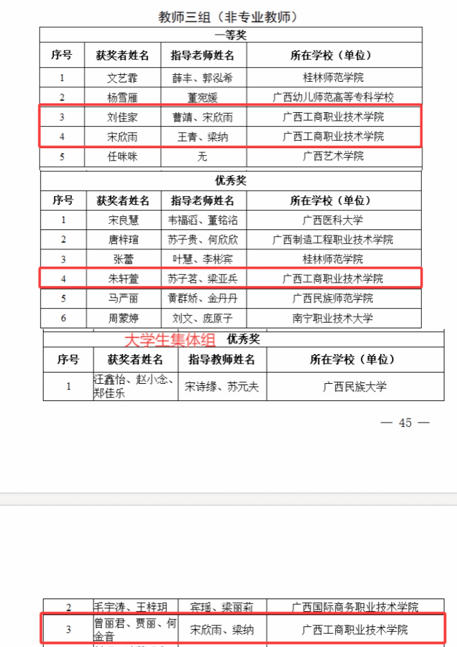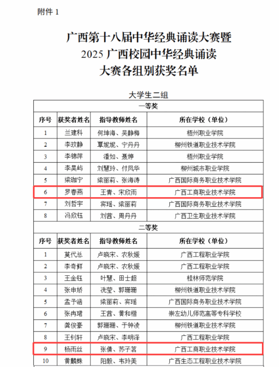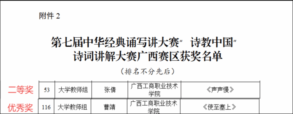 其中,在廣西第十八屆中華經(jīng)典誦讀大賽暨2025廣西校園中華經(jīng)典誦讀大賽大學(xué)生二組獲一等獎(jiǎng)1項(xiàng)、二等獎(jiǎng)1項(xiàng)、三等獎(jiǎng)4項(xiàng),教師三組(非專業(yè)教師)獲一等獎(jiǎng)2項(xiàng)、優(yōu)秀獎(jiǎng)1項(xiàng),教師三組(專業(yè)教師)獲優(yōu)秀獎(jiǎng)1項(xiàng),大學(xué)生集體組獲優(yōu)秀獎(jiǎng)1項(xiàng)。在第七屆中華經(jīng)典誦寫(xiě)講大賽"詩(shī)教中國(guó)"詩(shī)詞講解大賽(廣西賽區(qū))大學(xué)教師組獲二等獎(jiǎng)1項(xiàng)、優(yōu)秀獎(jiǎng)1項(xiàng)。