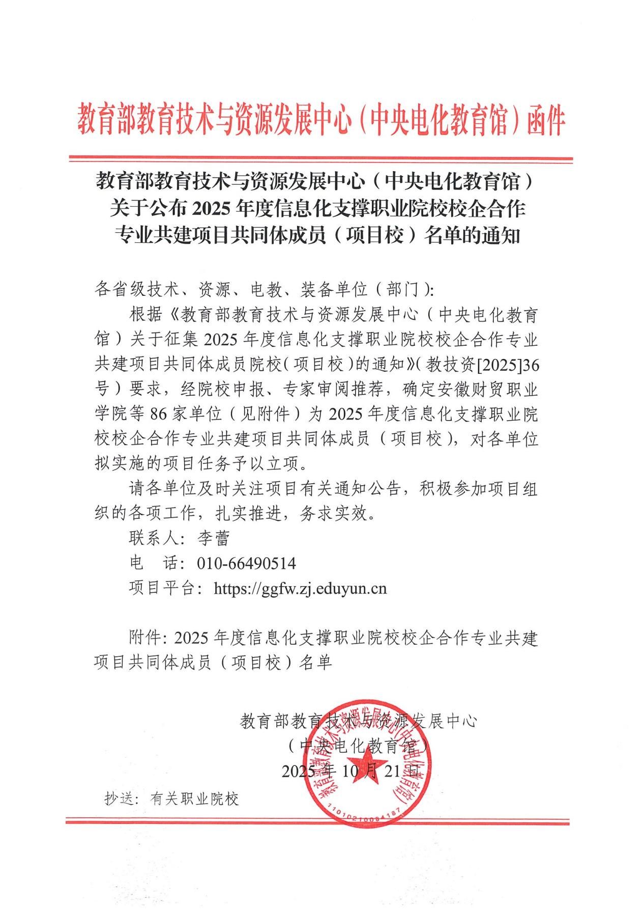 近日,教育部教育技術(shù)與資源發(fā)展中心(中央電化教育館)公布2025年度“信息化支撐職業(yè)院校校企合作專業(yè)共建項(xiàng)目”共同體成員名單,經(jīng)過嚴(yán)格的資格審查與專家評議,我校成功入選成為項(xiàng)目共同體成員。