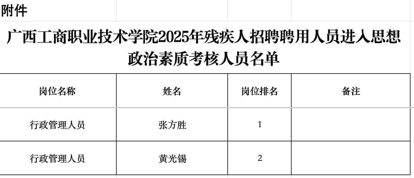 附件:廣西工商職業(yè)技術(shù)學(xué)院2025年殘疾人招聘聘用人員進(jìn)入思想政治素質(zhì)考核人員名單